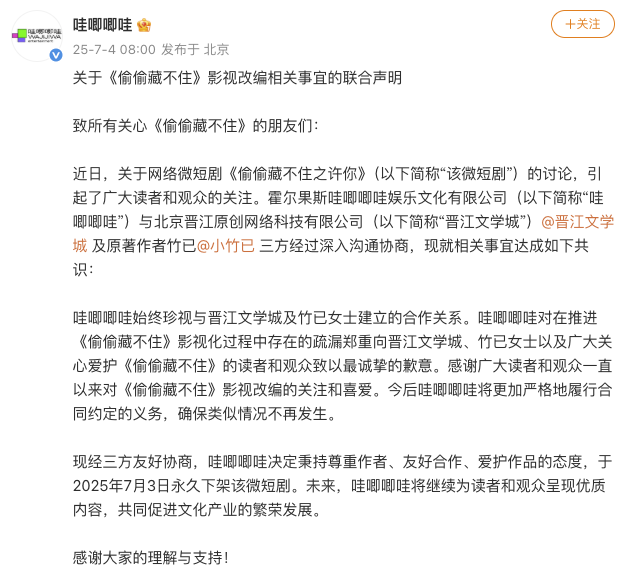 7月4日,@哇唧唧哇发布关于《偷偷藏不住》影视改编相关事宜的联合声明:哇唧唧哇始终珍视与晋江文学城及竹已女士建立的合作关系。哇唧唧哇对在推进《偷偷藏不住》影视化过程中存在的疏漏郑重向晋江文学城、竹已女士以及广大关心爱护《偷偷藏不住》的读者和观众致以最诚挚的歉意。现经三方友好协商,哇唧唧哇决定于2025年7月3日永久下架网络微短剧《偷偷藏不住之许你》。